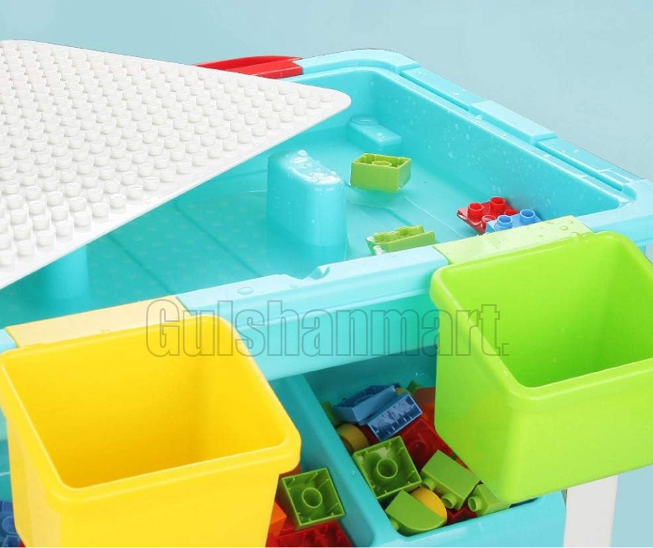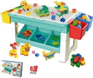 Durable kids’ play table with a block-compatible surface and attached storage bins. Includes colorful side containers for easy organization. Sized at 78cm x 35cm x 40cm.